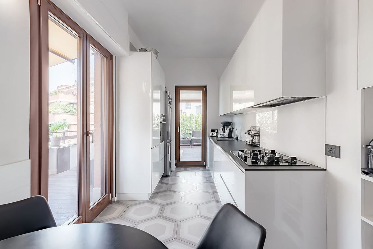 Light is the protagonist of this kitchen area, further enhanced by the choice of light, bright tones for the floor, walls, and kitchen itself. The minimalist, linear furnishings, together with reflective surfaces and luminous materials, further amplify the feeling of space and lightness, creating an environment where functionality and design come together.