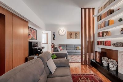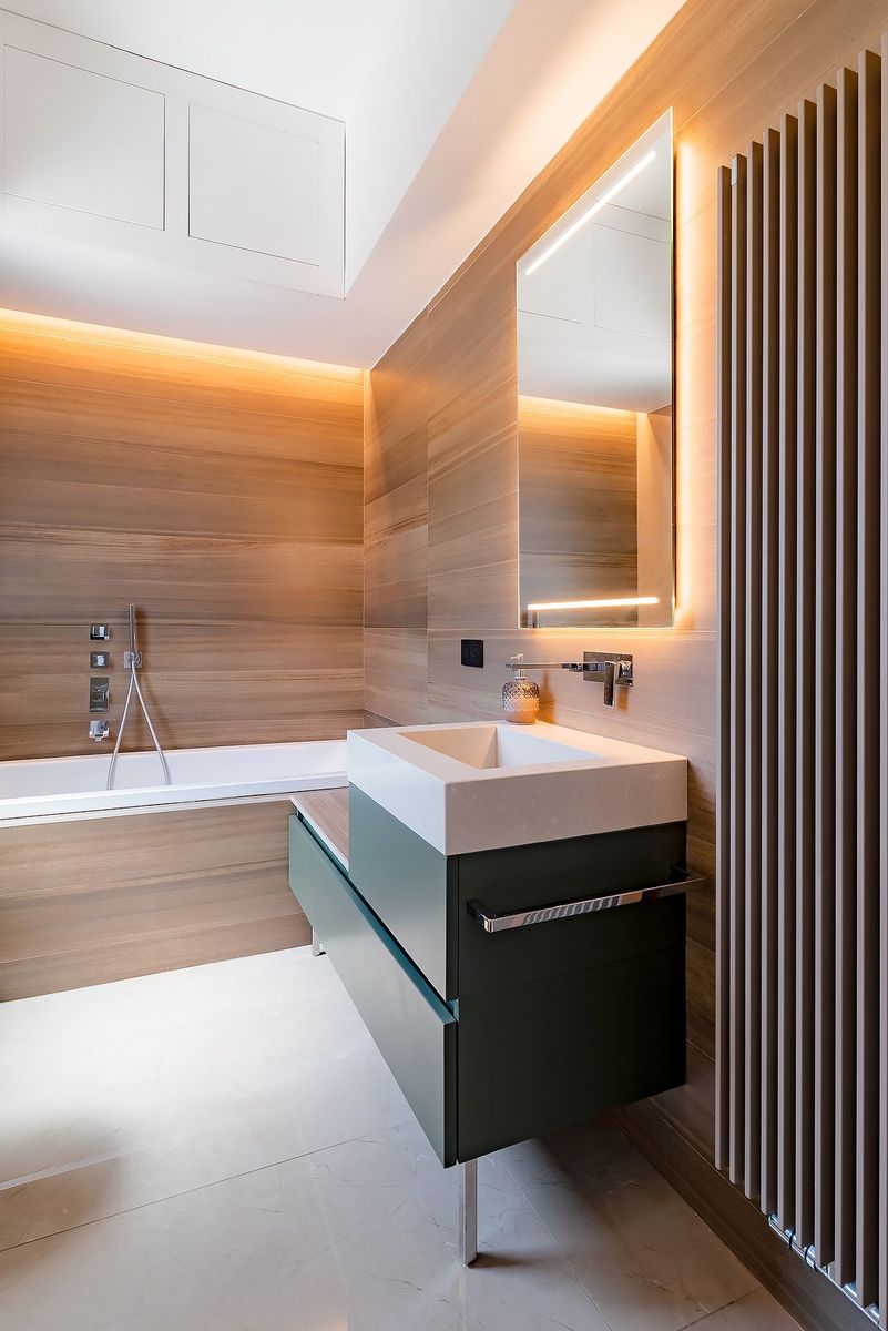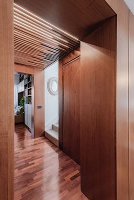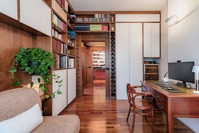A refined, spacious living area is created, from which a hallway leads to the study, where the woodwork creates a consistent style that perfectly connects the two rooms, blending them together. Wood and minimalist design are the protagonists of this space, perfectly balanced with tone-on-tone contrasts.