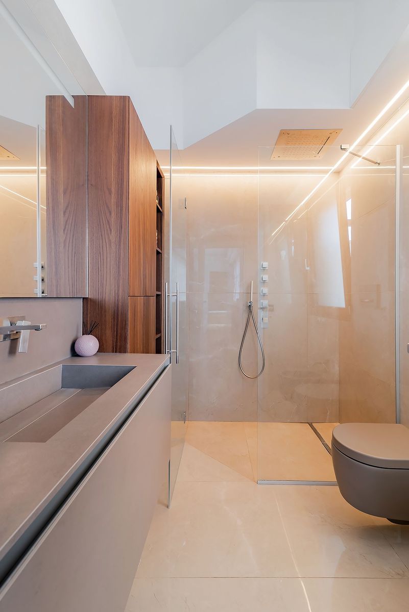 A penthouse and super penthouse to be designed and renovated in the Tuscolana area, with large terraces to be revalued in order to fully exploit the property's potential. The project was conceived with the aim of completely redefining the living experience, focusing on light, continuity between interior and exterior, and maximum functionality of the spaces. Oasi Home Design translates this into a real revolution in the internal layout: the rooms are redesigned to be more fluid, bright, and consistent with a contemporary lifestyle. The carpentry, designed down to the smallest detail, becomes an integral part of the architecture, integrating with the lighting to create calibrated scenarios and refined atmospheres.