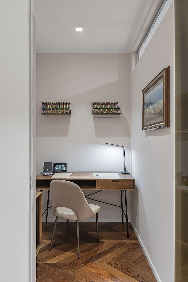 The living area is designed as the convivial heart of the home, expressing openness, brightness, and visual continuity. The space flows directly into the kitchen area, creating a harmonious environment. To encourage sharing and daily conviviality, a solution combining elegance and functionality has been designed: a retractable glass wall that allows the two rooms to be separated without interrupting the perception of space and light. This discreet element allows the space to be used according to the needs of the moment, always ensuring aesthetic consistency and formal lightness.