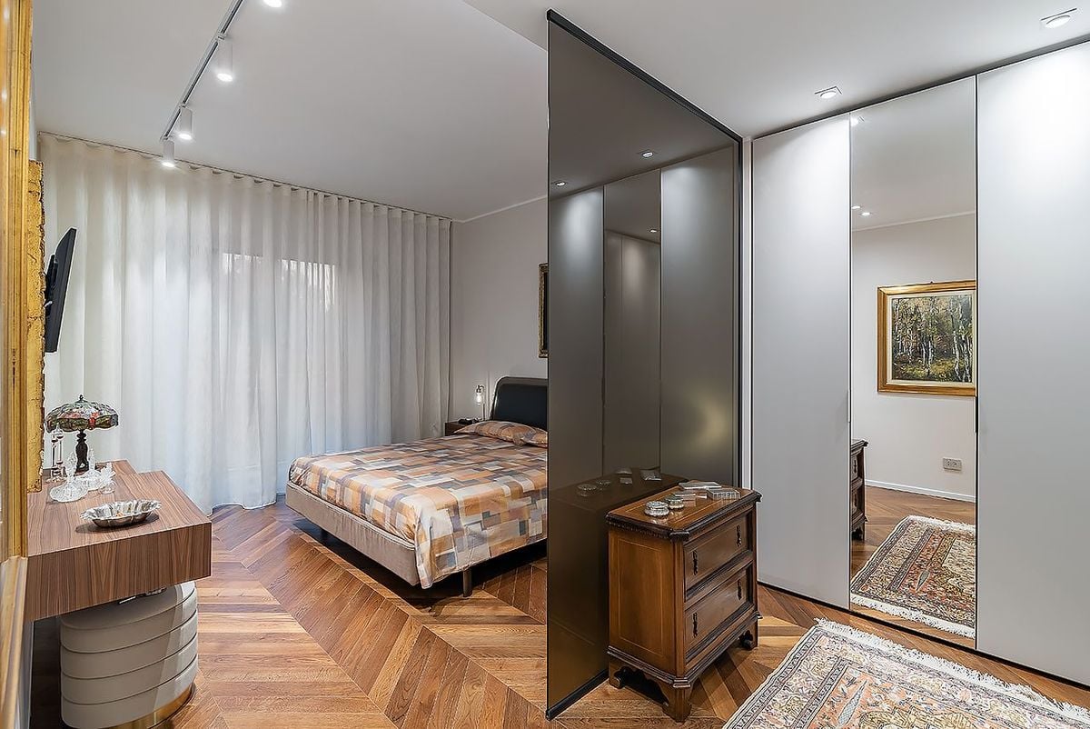 The sleeping area is a large, spacious environment, designed to be private yet airy, making the most of the natural light. A light, floor-to-ceiling glass partition has been designed to separate the wardrobe area from the sleeping area. This element defines the spaces without weighing them down, preserving transparency and visual dialogue between the different areas. The glass maintains the feeling of spaciousness while ensuring proper organization and privacy.