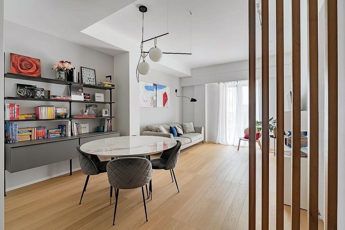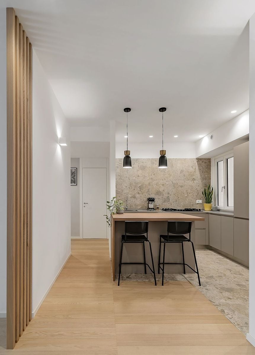 The living area opens onto a minimalist yet welcoming kitchen, where the visual continuity is interrupted by a change in flooring that clearly defines the working area. The contrast with the tatami-style parquet flooring enhances the geometry of the rooms, creating a dialogue between materials and functions and giving the space a contemporary, youthful, and surprisingly warm character.