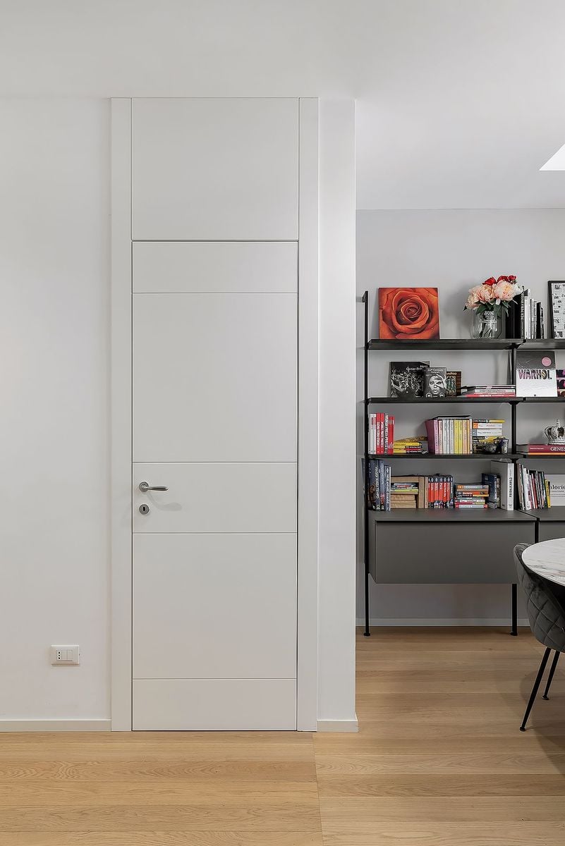 The watchword? Simplicity. A palette of light colors amplifies natural light and creates an airy, relaxing atmosphere. In this measured balance, doors and boiserie are not simply functional elements, but are transformed into true decorative surfaces that, integrated into the architectural design, punctuate the walls with rhythm and proportion.