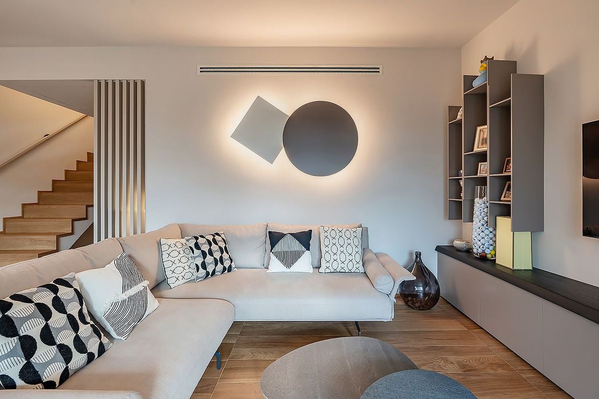 The wooden floor, with a natural finish, adds elegance and warmth to the room, becoming the material basis of the project. Its shade interacts with the neutral colors of the sofa and walls, creating a harmonious and contemporary balance. An integrated lighting system, with light cuts and spotlights, enhances the surfaces and emphasizes the volumes, highlighting the verticality of the two-level space.