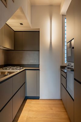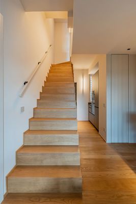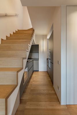 A small apartment spread over two levels, connected by a wood-covered staircase that is not only a functional element but also the true focal point of the design. Its design sculpts the space, bringing together the kitchen area, while the open steps align with one of the strips of parquet flooring laid in a “tatami” pattern, creating a refined interplay of geometries and directions. The material continuity between the floor and the staircase amplifies the perception: the result is a compact but dynamic environment, in which every detail contributes to defining a coherent, warm, and contemporary identity.